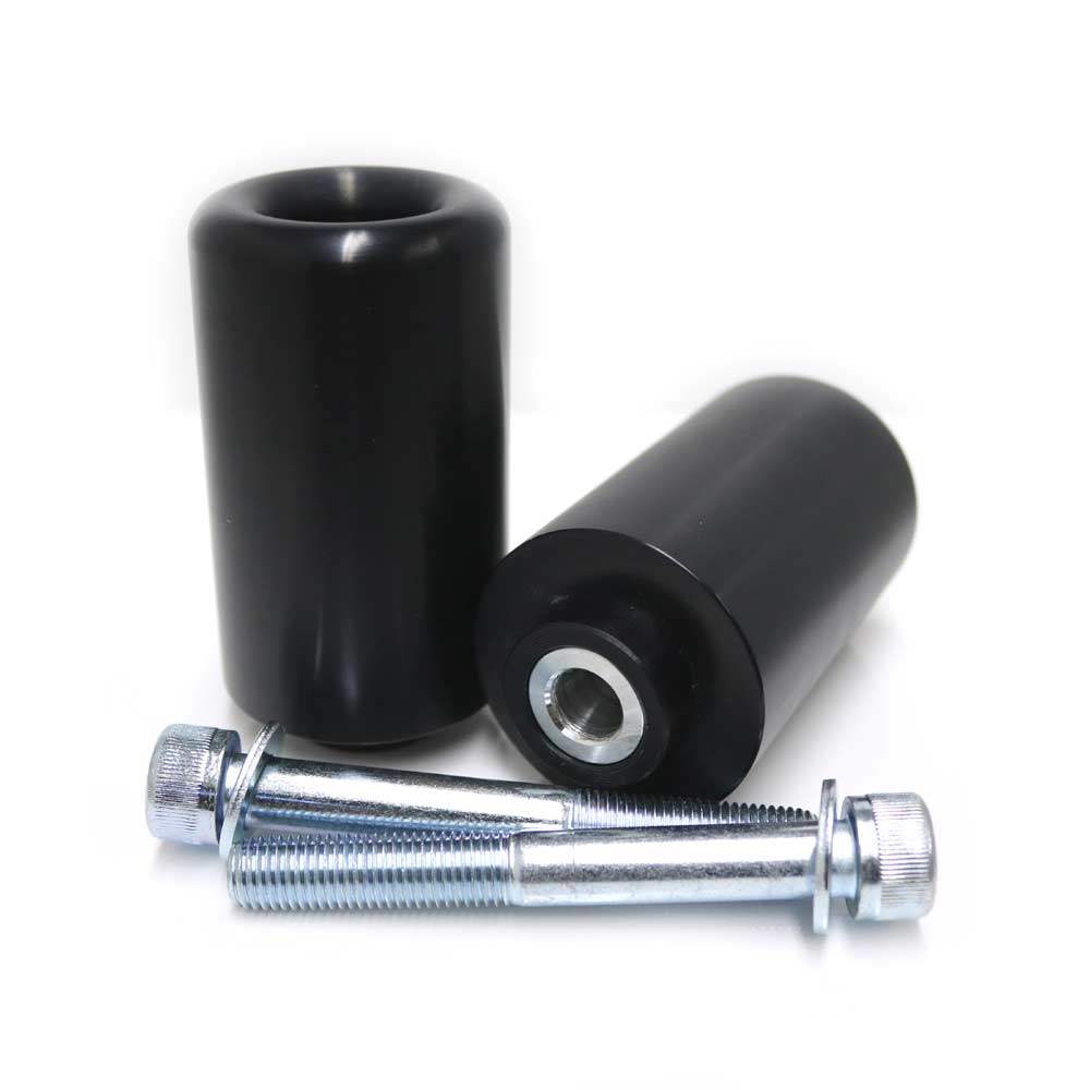 Shogun frame sliders are superior to other frame slider brands by virtue of their construction and material. Shogun pucks are made of shatter-proof UHMW infused with UV protective polymer. Shogun pucks absorb kinetic energy from crashes and will not shatter in cold temperature like some types of Delrin or fade in the sun. Each puck has a press fit aluminum bushing to hold it in place during impact to reduce the risk of the puck tearing off of the mounting point. Shogun frame slider offsets are CNC machined from the same grade aluminum as military aircraft. Offsets are anodized black to match OEM components. Each offset is manufactured to stringent specifications with ISO 9000 quality control. Each Shogun Frame Slider comes with high tensile strength corrosion resistant hardware (cheap imitators do not use high grade hardware and will quickly rust). Shogun uses socket head bolts in nearly every kit, allowing for stronger frame slider design in a more compact space. Newer applications of Shogun Frame Sliders make use of a counter sunk design, which distributes the force of impact over a wider area and gives additional strength to the system so that the puck remains attached to the motorcycle.